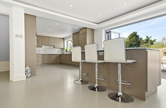 A hard wearing seamless rubber floor was specified for this particular project which would serve as a functional living space but also be home to the property owners three large dogs. The specified product had to withstand every day use but also take into consideration K9 occupants requirements also. Following careful consideration our Poured Resin Acoustic Comfort Floor was chosen as the product of choice.
